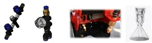 ●Standard equipment includes PT136305 (PTC cross-type water distributor), PT136300 (PTC one-to-two water distributor), with pressure regulating and stabilizing functions, which can achieve section-by-section balanced pressure regulation, and equal spraying; ●Standard equipment includes German imported Lenzina copper conical universal nozzle, one nozzle is placed inside the sliding knife type furrow openers, and the other is at the seeding unit's seeding position, which can spray pesticides simultaneously on the two sides of the V-shaped furrow and the surface of the seed potatoes, ensuring even spray distribution; |